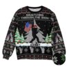 The design is an instant classic: a powerful Bigfoot silhouette strides confidently through a winter wonderland, Santa hat perched jauntily on his head. In his grasp, he proudly carries a beautifully detailed American flag, its stars and stripes a bold declaration against the snowy pines. Above this iconic scene, the phrase “Squatching Through The Snow” is knitted directly into the fabric, framed by classic Nordic-inspired holiday patterns. Every detail, from the festive trees to the delicate snowflakes and Bigfoot footprints, is crafted to create a visually stunning and hilarious holiday masterpiece.