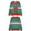 This sweater captures the terrifying spirit of the film that hijacked the holidays. The design is a masterpiece of festive fear, featuring a terrifyingly cheerful Art the Clown front-and-center, grinning beneath his ill-fitting, blood-stained Santa hat. Behind him, a pair of bloody axes replace the traditional candy canes, set against a chaotic backdrop of classic “knit” patterns, snowflakes, and festive trees. The word “TERRIFIER” is proudly displayed, woven directly into the pattern, leaving no doubt about your holiday allegiance.