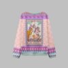 The design is rendered in a breathtaking palette of lavender, rose pink, soft mint green, and radiant gold, ensuring you stand out in the sea of traditional red and green. The sleeves and background feature a subtle, elegant pattern of tied ribbons, while the cuffs, collar, and hem boast a unique, Fair Isle-inspired design complete with intricate snowflakes, geometric patterns, and tiny horse silhouettes, tying the entire mystical theme together.