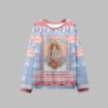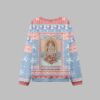 At the heart of this unique sweatshirt is a beautifully illustrated tarot card, “0 – The Zero Of Fucks.” A clever parody of “The Fool” card from a traditional tarot deck, this design symbolizes a journey of blissful liberation from trivial concerns and holiday drama. The artwork features two skeletal hands, elegantly raised in a universally understood gesture of defiance, set against a celestial, chapel-window backdrop. Surrounded by delicate roses and a soft, snowy sky, the design achieves a perfect balance between pastel goth aesthetics and ironic holiday cheer. The surrounding pattern features classic Christmas elements like reindeer, snowflakes, and holly, all rendered in a stylish color palette of powder blue, soft pink, and crisp white, making the central message even more impactful.