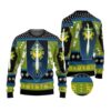 The design is a vibrant tapestry of Alaitoc’s signature colors: a deep, starlit blue and a striking, verdant green-yellow, reminiscent of their Craftworld’s sigil. Every inch of this sweater is a tribute to the lore, from the intricate Aeldari runes adorning the sleeves to the classic “ugly sweater” patterns like snowflakes and geometric shapes, all given a distinctly xenos twist. It’s the perfect attire for celebrating the holidays while plotting your next strategic victory on the tabletop.