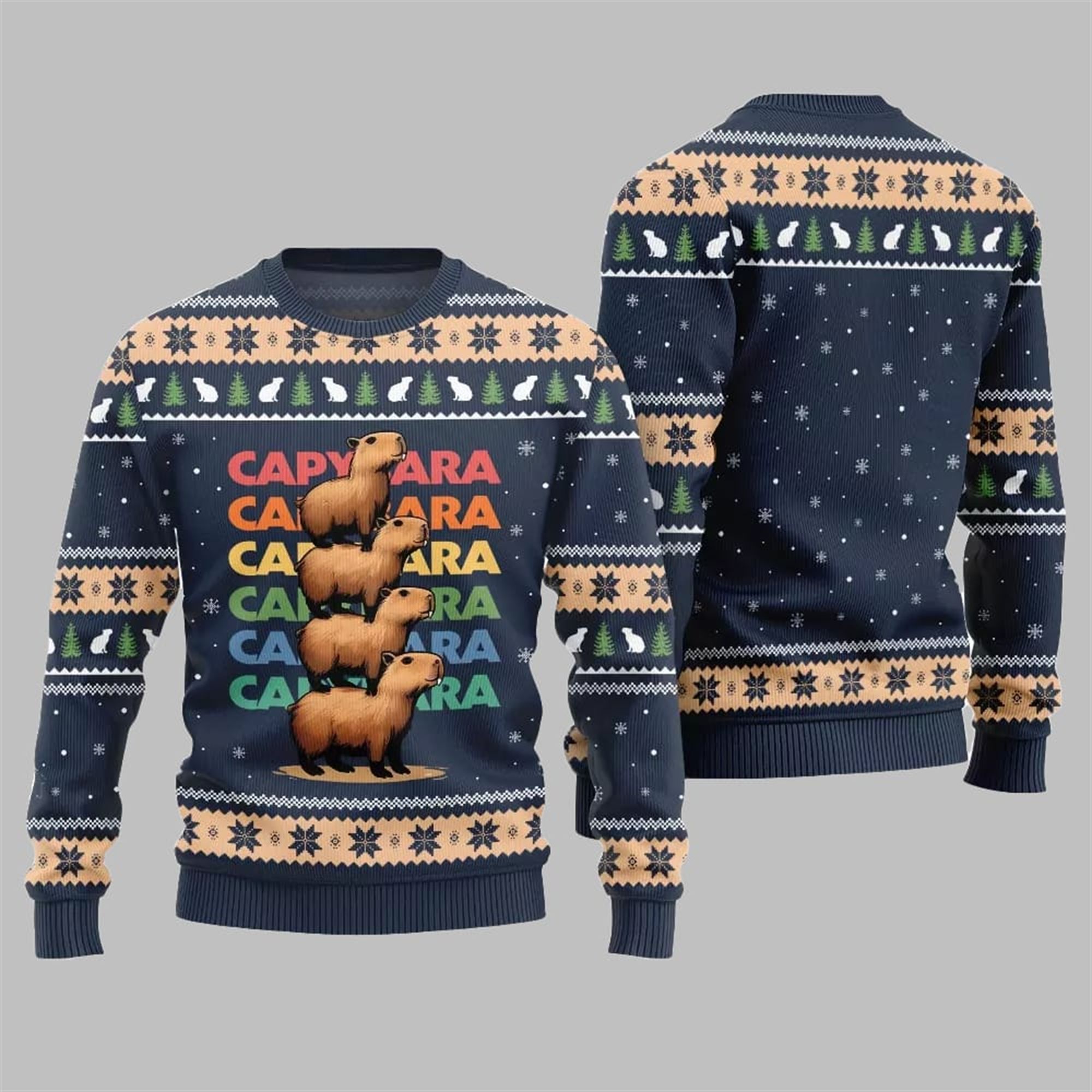 This expertly designed pullover captures the heartwarming and hilarious spirit of the internet’s favorite animal in a classic ugly sweater format. The centerpiece of the design is an adorable tower of four capybaras, stacked one on top of the other, bringing a whimsical “We Bare Bears” parody to life. Set against a vibrant royal blue background, the repeating, colorful “CAPYBARA” text creates a visually dynamic and playful effect. The entire sweater is adorned with traditional festive patterns, including crisp white snowflakes, charming Christmas trees, and rows of Nordic-inspired motifs, ensuring it perfectly fits the holiday theme while letting your quirky personality shine.
