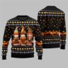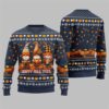Forget bland fall fashion. The centerpiece of this sweater features three charming gnomes, each with a unique, patterned hat—from classic buffalo plaid to festive sunflowers. Holding pumpkins and a warm drink, they invite everyone to join in the “Happy Fall Y’all” spirit. The brilliant blue backdrop makes the festive oranges, browns, and whites pop, creating a visually delightful pattern of pumpkins, snowflakes, and swirling leaves that wraps around the entire sweater.
