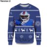 This sweater features Stefon Diggs in a Bills uniform, complete with knitted snowflakes, reindeer, and a festive hem. The bright print contrasts perfectly with the dark blue wool base, creating a strong Bills identity. Ribbed cuffs and hem for a snug fit, while the soft wool provides all-day comfort. Durable stitching makes it easy to re-wear throughout the season. It’s the perfect mix of bold athletic style and traditional Christmas sweater style.