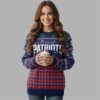 - Bold Slogan & Logo: The chest proudly displays the “We are all PATRIOTS” text above the modern, iconic “Flying Elvis” team logo, set against a classic Christmas sweater pattern.