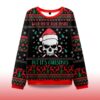 This sweater features a striking skull wearing a Santa hat, flanked by candy canes, snowflakes, and traditional Christmas motifs in red, green, and black. Bold lettering, adds a touch of irony, perfect for standing out at holiday events. Red cuffs, hem, and neckline complete the look with a bright, vibrant accent.
