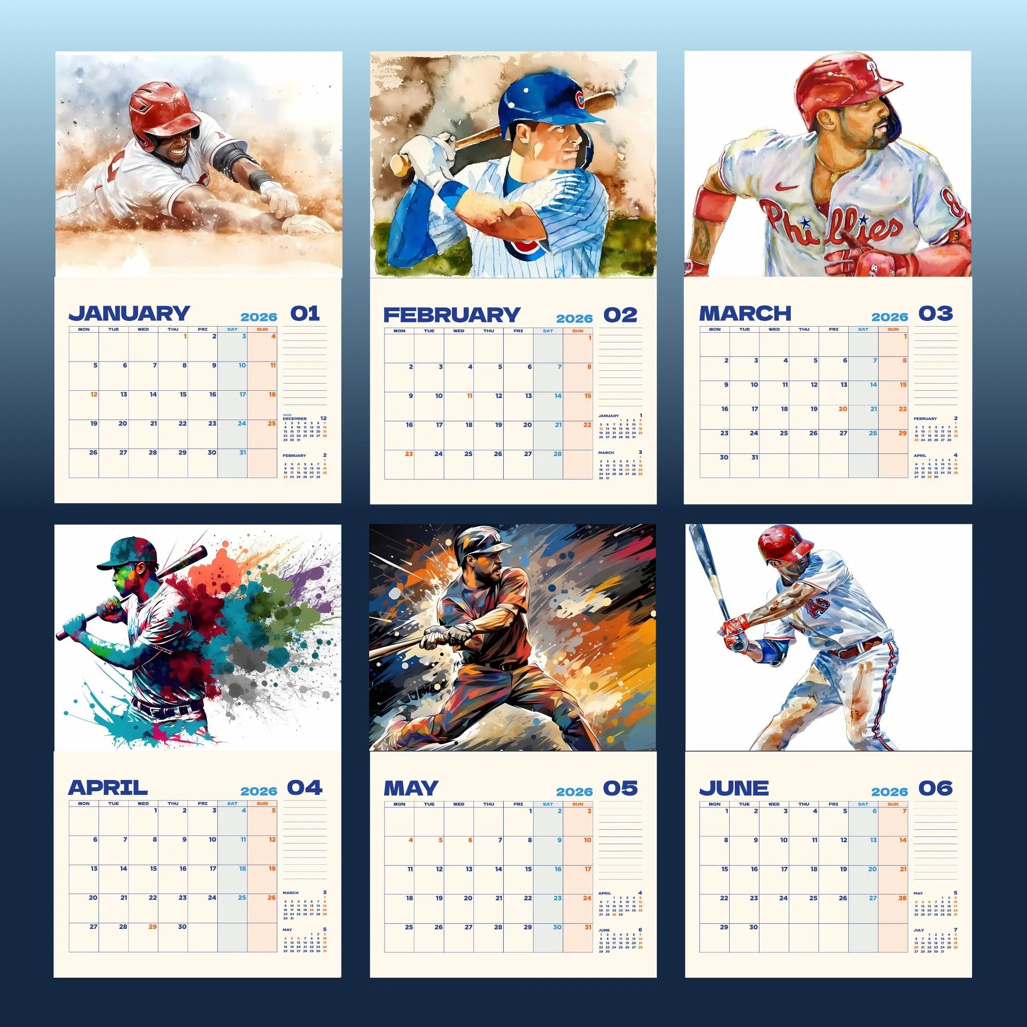 2026 Baseball Calendar, Sports Calendar, Watercolor Baseball Art, Baseball Player Illustration, Gift for Baseball Fans