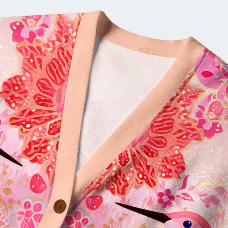 The “Birdsong And Blossoms Ugly Cardigan Sweater” is a dramatically unique piece of knitwear that masterfully clashes cozy comfort with viral, absurdist imagery. The soft, beige and gray background features a high-definition photographic print of two rats holding and seemingly sharing a cigarette, captured with surprising clarity and expression. This unexpected, edgy image is framed by bold, bright pink trim along the V-neck, placket, and cuffs, immediately elevating the absurdity to a statement of fearless fashion. The sleeves are accented with festive, geometric knit patterns in shades of pink and brown, contrasting the central image with cozy, traditional motifs. This design is a masterstroke of ironic comedy and social subversion. It transforms the traditionally wholesome cardigan into a badge of rebellious humor, symbolizing a witty rejection of overly polished perfection and a celebration of the strange, raw, and often chaotic moments of life. It’s a warm, comfortable, and immediately eye-catching piece that is perfect for the meme enthusiast, the punk aesthetic lover, or anyone ready to be the center of a wonderfully intriguing and funny conversation. The button-down style ensures it is versatile for layering over tees or dresses.