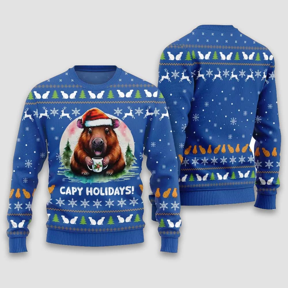 Forget Rudolph and his crew! This year, it’s all about celebrating Capymas with the coolest critter on the block – the capybara. Our Capybara Capymas Merry Christmas Ugly Christmas Sweater is here to bring a whole new level of chill to your holiday season. Get ready to make a splash with this one-of-a-kind design that’s guaranteed to turn heads and spark some serious holiday cheer.