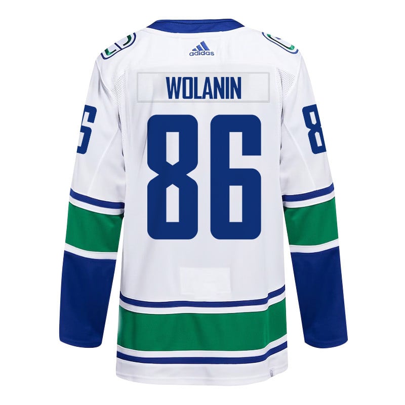 Christian Wolanin 86 Vancouver Canucks 2024 NHL Playoffs Patch Away Hockey Jersey – Men, White – JS351