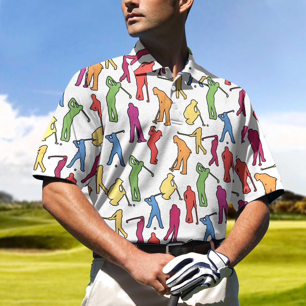 Colorful Male Golfer Short Sleeve Polo Shirt, White Silhouette Polo Shirt, Best Golf Shirt For Men