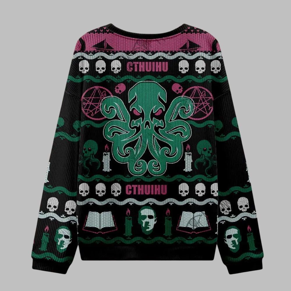 The intricate design features the High Priest of the Great Old Ones, Cthulhu himself, rendered in a striking green against a void-black background. Flanked by arcane symbols, glowing candles, forbidden tomes, and rows of ominous skulls, this sweater tells a story—a yuletide carol sung in a forgotten tongue. The vibrant pink and white accents cut through the darkness, creating a visually stunning piece that’s equal parts festive, fearsome, and fashionable.