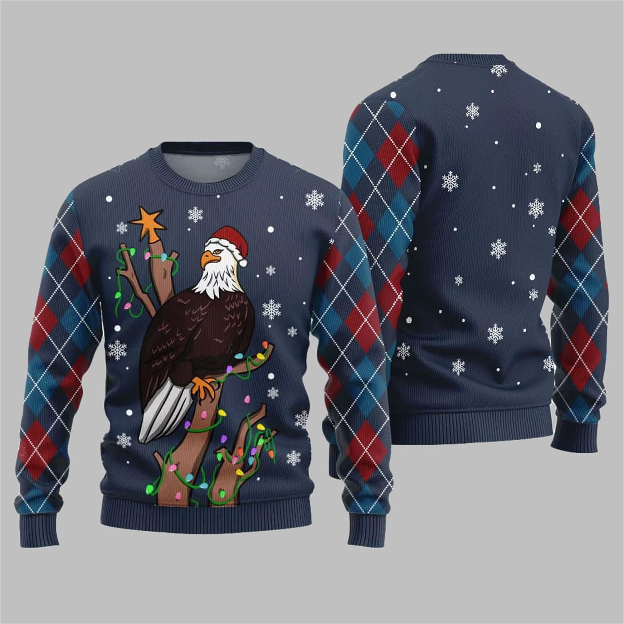 The centerpiece is a beautifully rendered Bald Eagle, perched proudly on a tree branch. But this is no ordinary eagle; it’s fully embracing the Christmas spirit with a bright red Santa hat perched jauntily on its head. The tree branch itself is wrapped in a tangle of colorful, glowing Christmas lights, with a shining star at the very top, mimicking a Christmas tree. The eagle’s sharp, determined gaze paired with the playful holiday attire creates a delightful contrast that is guaranteed to bring smiles and start conversations. The design is completed with classic argyle patterns in red and navy blue on the sleeves, adding a traditional “ugly sweater” touch to this modern masterpiece.