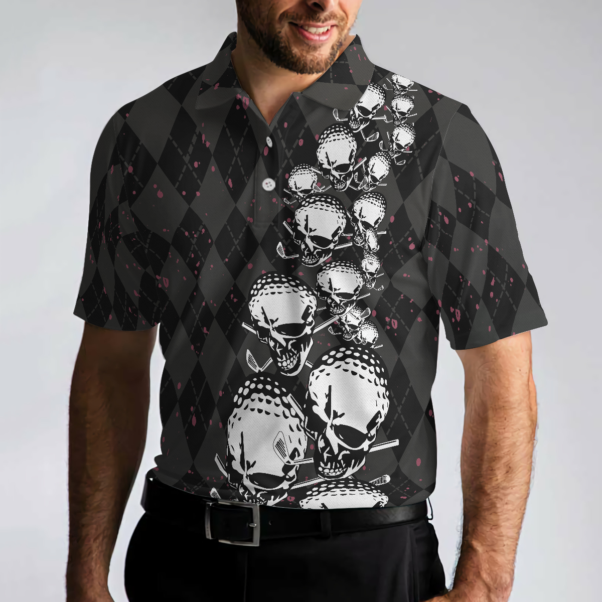 Elegant Argyle Pattern And Skull Golf Lover Polo Shirt, Black Skull Golf Shirt For Men