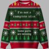 The “Funny Idiot Ugly Christmas Sweater” is a vibrant, cozy pullover that flawlessly merges traditional holiday knitwear with sharp, modern self-aware comedy. The sweater features a bold, classic red and deep green color palette, framed by traditional “ugly sweater” patterns of snowflakes, miniature Christmas trees, and gingerbread men. The front of the sweater delivers the perfect, dry-witted punchline in two separate lines of white text. The upper text declares: “I’m not a complete idiot,” while the lower text finishes the thought with: “Some parts are missing.” This design is a masterstroke of ironic comedy, perfectly capturing the universal feeling of cognitive overload, forgetfulness, or just the general confusion that accompanies the demanding holiday season. It transforms the sweater from mere apparel into a statement of charming, self-deprecating wit, symbolizing the wearer’s refusal to take themselves too seriously and their appreciation for lighthearted humor. It’s a warm, comfortable, and immediately eye-catching piece that is perfect for the jokester, the stressed-out student, or anyone ready to be the center of a hilarious, sympathetic conversation about simply making it through the year.