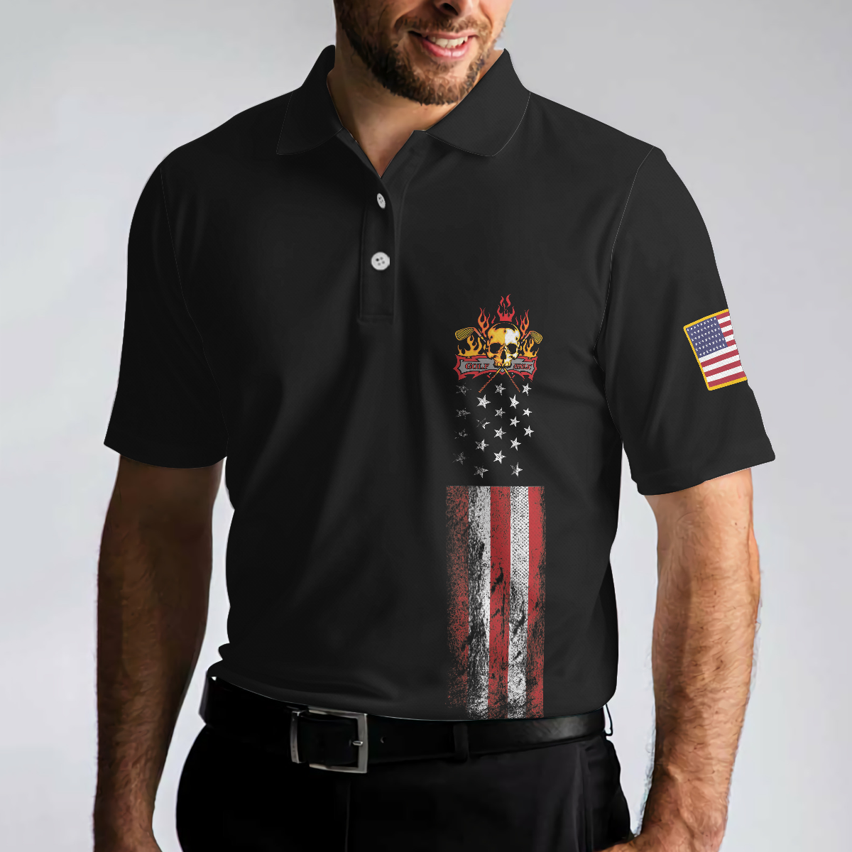Golf Skull America Flag Short Sleeve Polo Shirt, Wet Paint Black Polo Shirt, Best Golf Shirt For Men