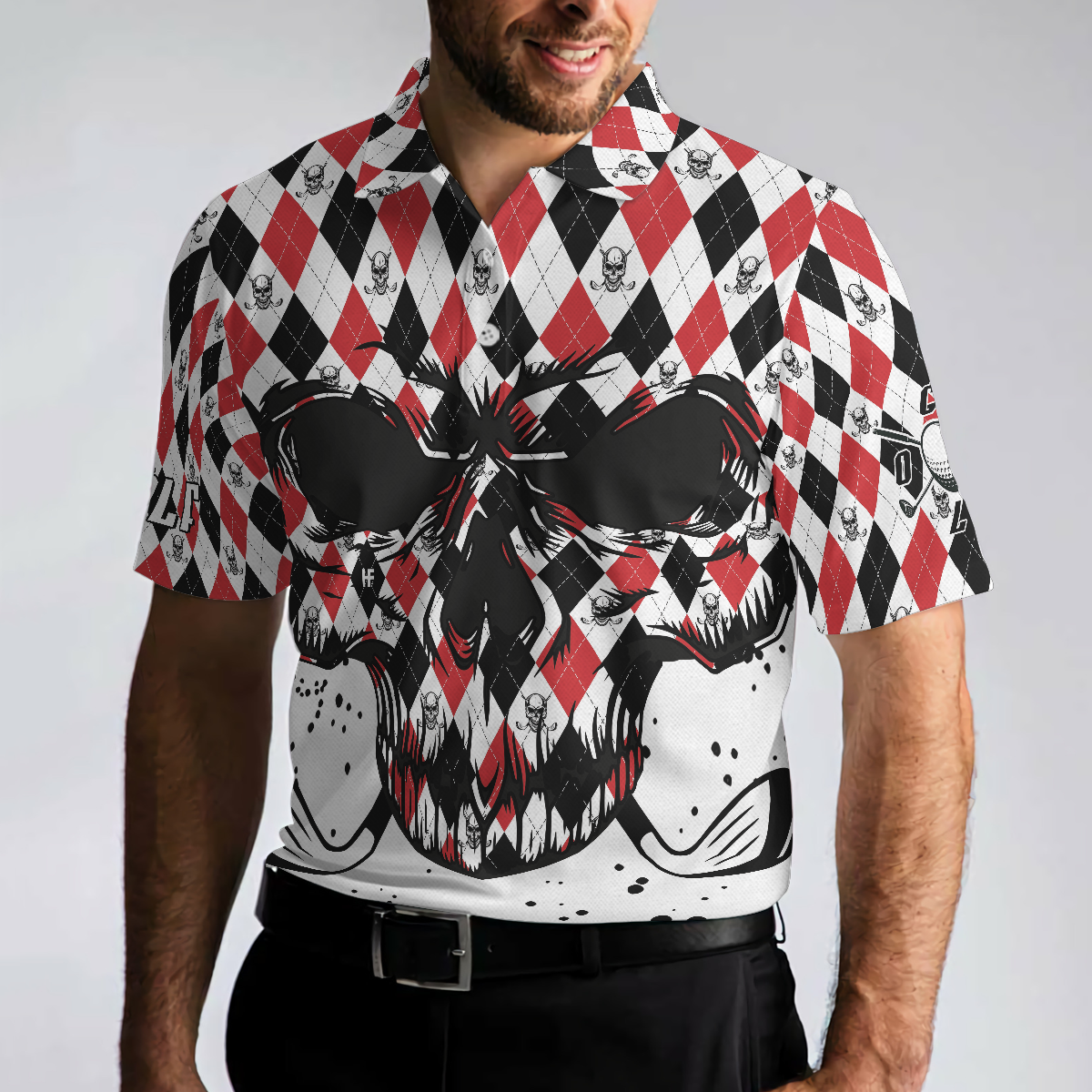 Golf Skull Red Black And White Pattern Polo Shirt, Argyle Pattern Polo Shirt, Best Golf Shirt For Men