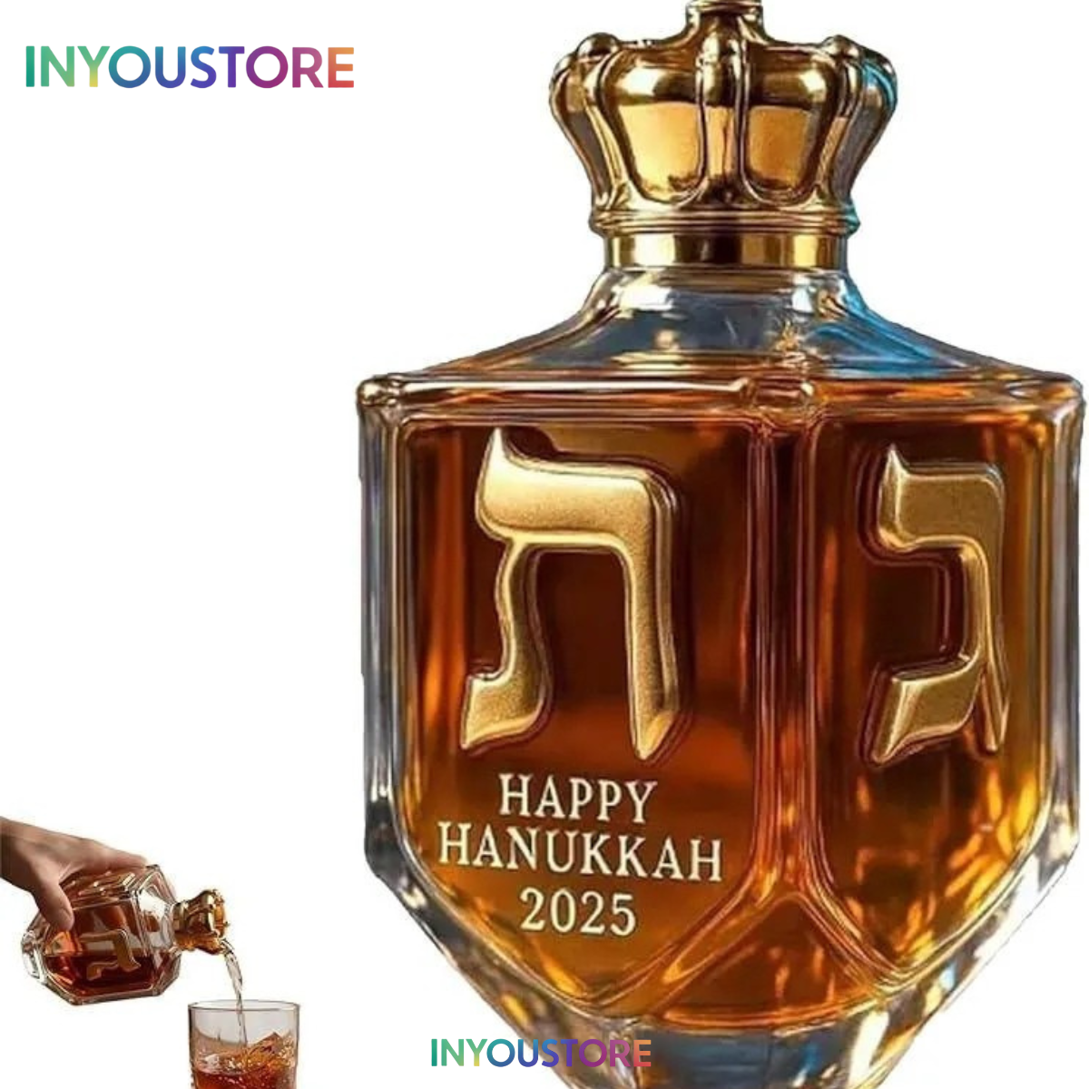 Happy Hanukkah 2025 Whiskey Bottle, Gold Rimmed High Borosilicate Glass Whiskey Bottle