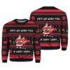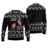 This classic red and white sweater uses the traditional “ugly Christmas sweater” aesthetic to deliver a hilariously controversial message. The design features familiar Nordic and festive patterns—including reindeer, snowflakes, and Christmas trees. The central graphic, rendered in crisp white, shows a station wagon with a Christmas tree strapped to the roof—a classic holiday scene. However, below the image, the text boldly, and absurdly, reads: “HIT HIM WITH YOUR CAR.”