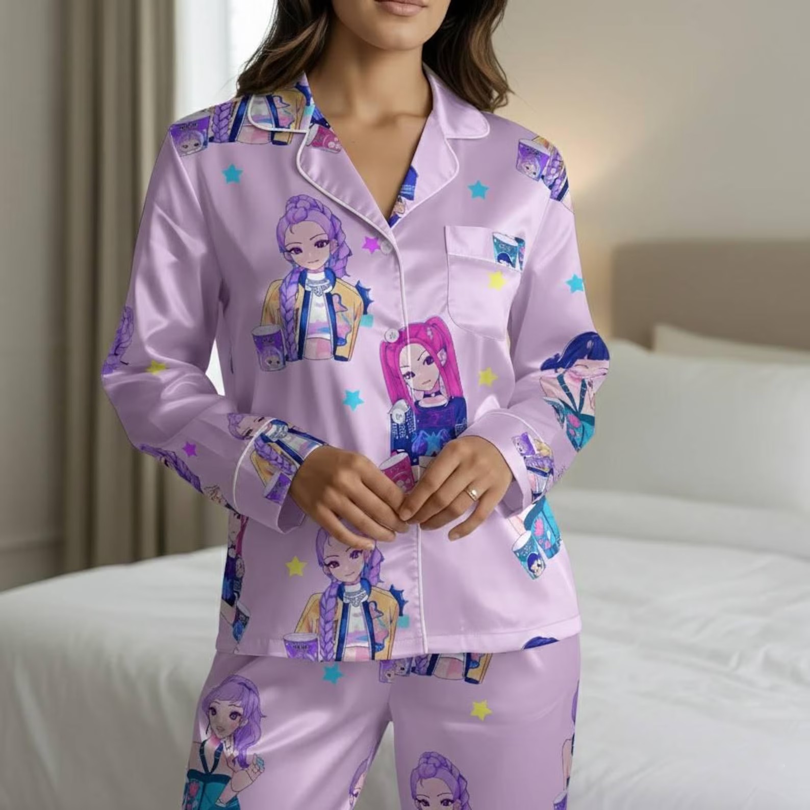 Huntrix Mira Rumi Joey Satin Pajamas Set, Girl Group K-Pop Sleepwear, KPop Demon Hunters Pajamas, Gift for Kpop Lovers, Demon Hunters Pajama