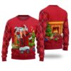 This Inappropriate Naughty Ugly Christmas Sweater features a playful twist on classic Christmas imagery. The sweater depicts a pair of, shall we say, “festive ornaments” adorned with red bows and baubles, all set against a skin-tone background. A vibrant green elf-inspired bottom, complete with a gold buckle belt and red buttons, adds a whimsical touch. The back of the sweater continues the elf theme with a solid green panel accented by a red and white trim, ensuring you’re spreading holiday cheer from all angles.