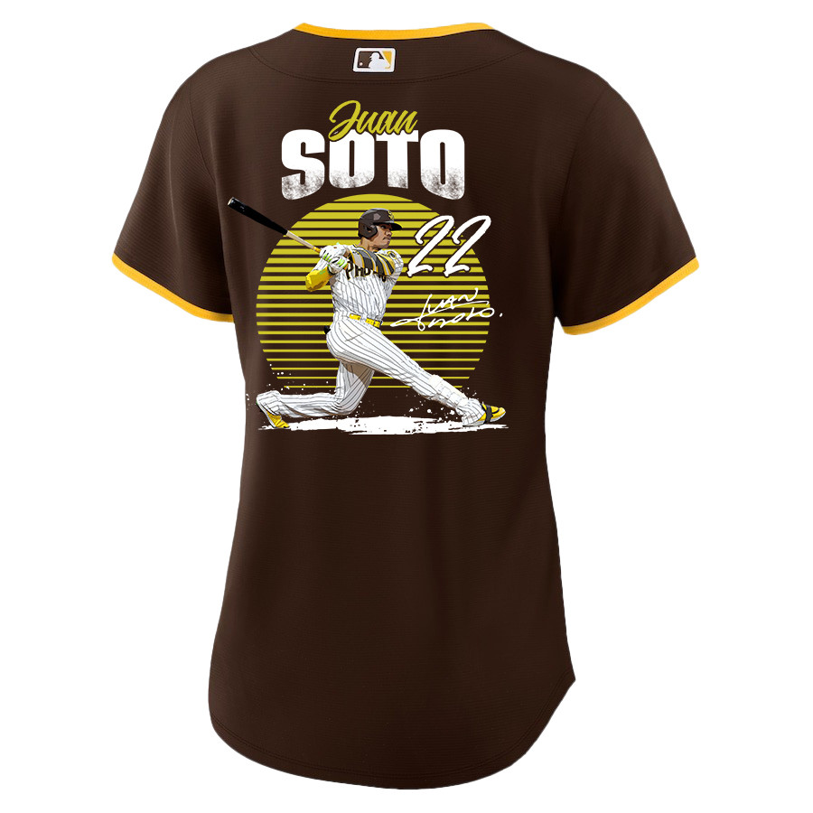 Juan Soto 22 San Diego Padres Signed Hit 2023 Road Player Women Baseball Jersey – Brown