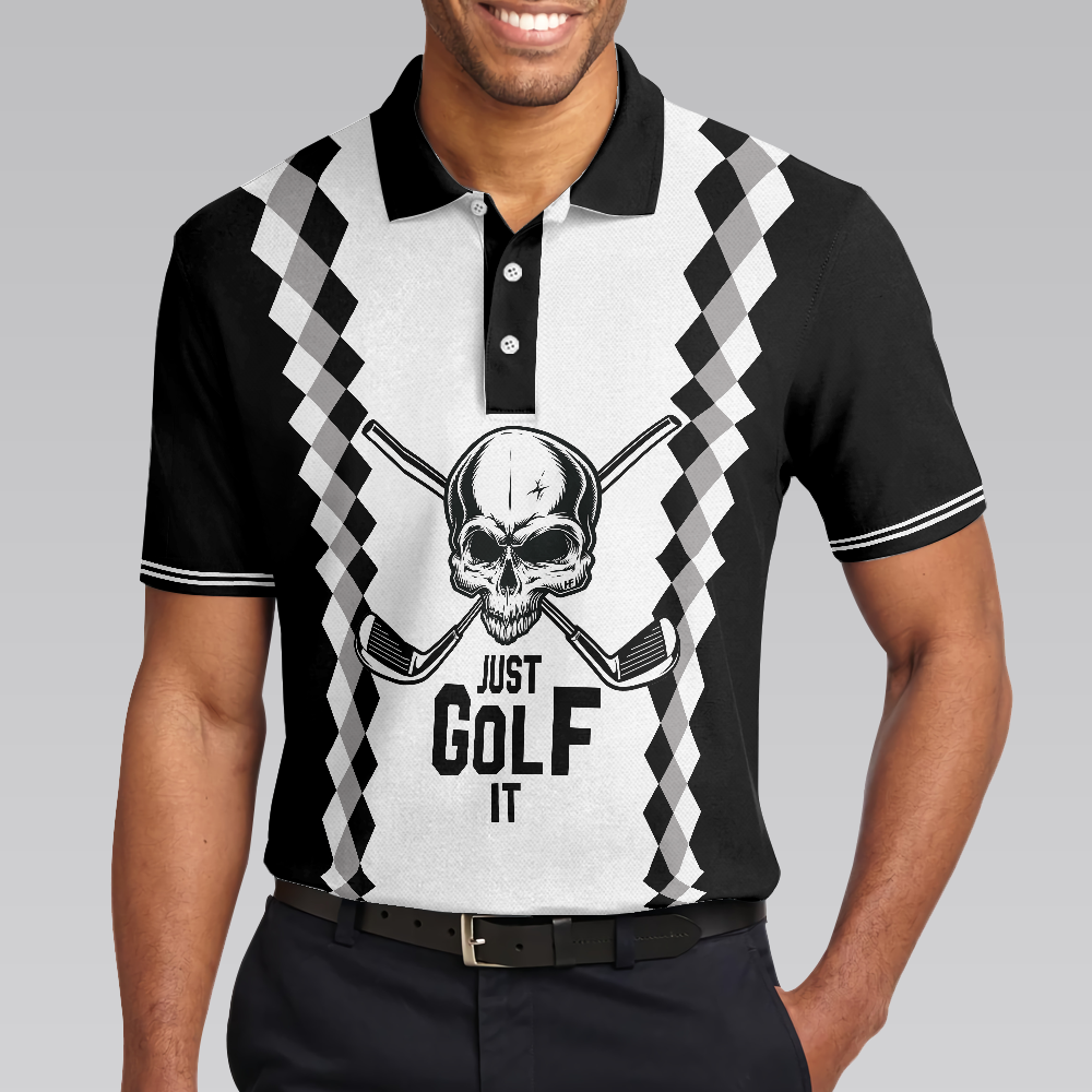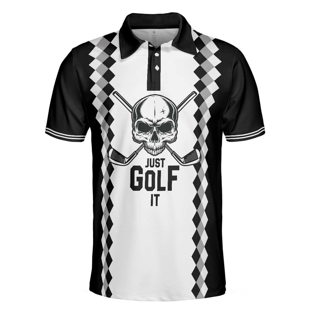 Just Golf It Skull Short Sleeve Golf Polo Shirt, Black And White Golf Shirt For Men