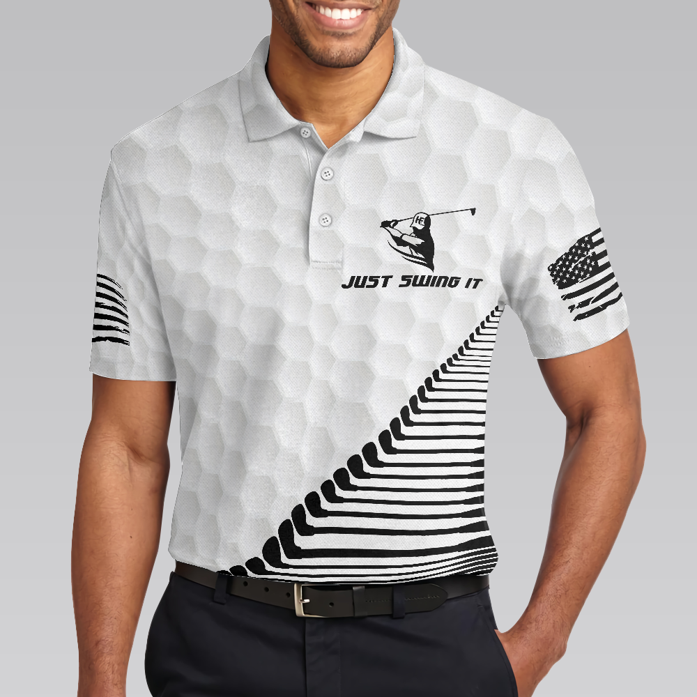 Just Swing It American Golfer Polo Shirt, Black And White American Flag Golf Shirt For Men