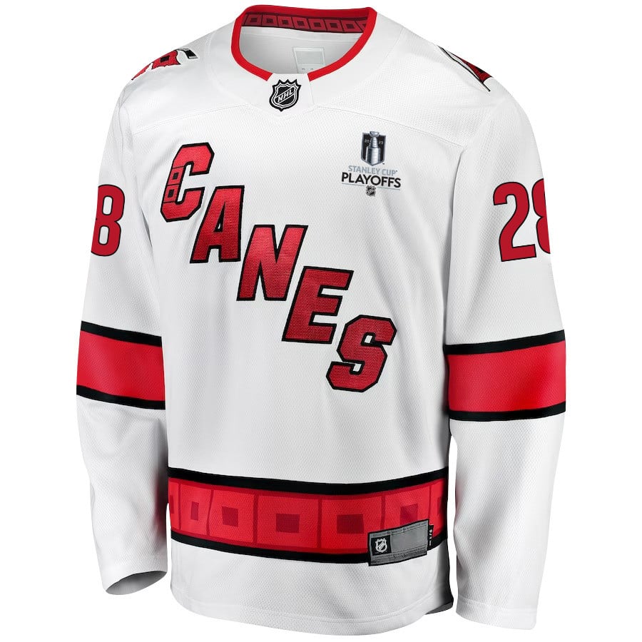 MacKenzie MacEachern 28 Carolina Hurricanes Stanley Cup 2023 Playoffs Patch Away Breakaway Men Hockey Jersey – White – JS373