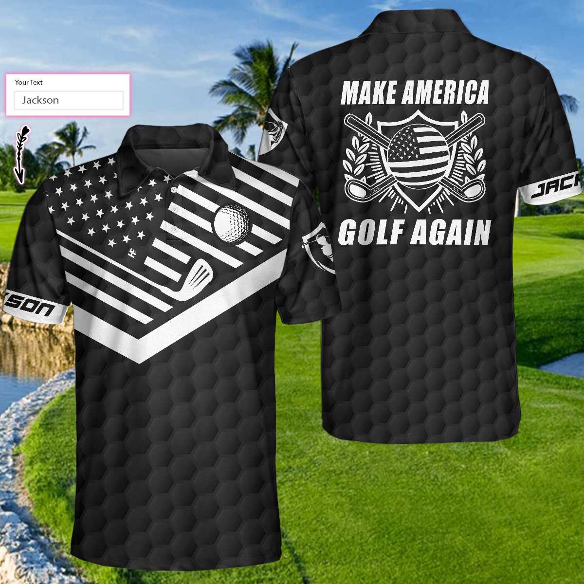 Make America Golf Again Custom Polo Shirt, Personalized Black American Flag Golf Shirt For Men