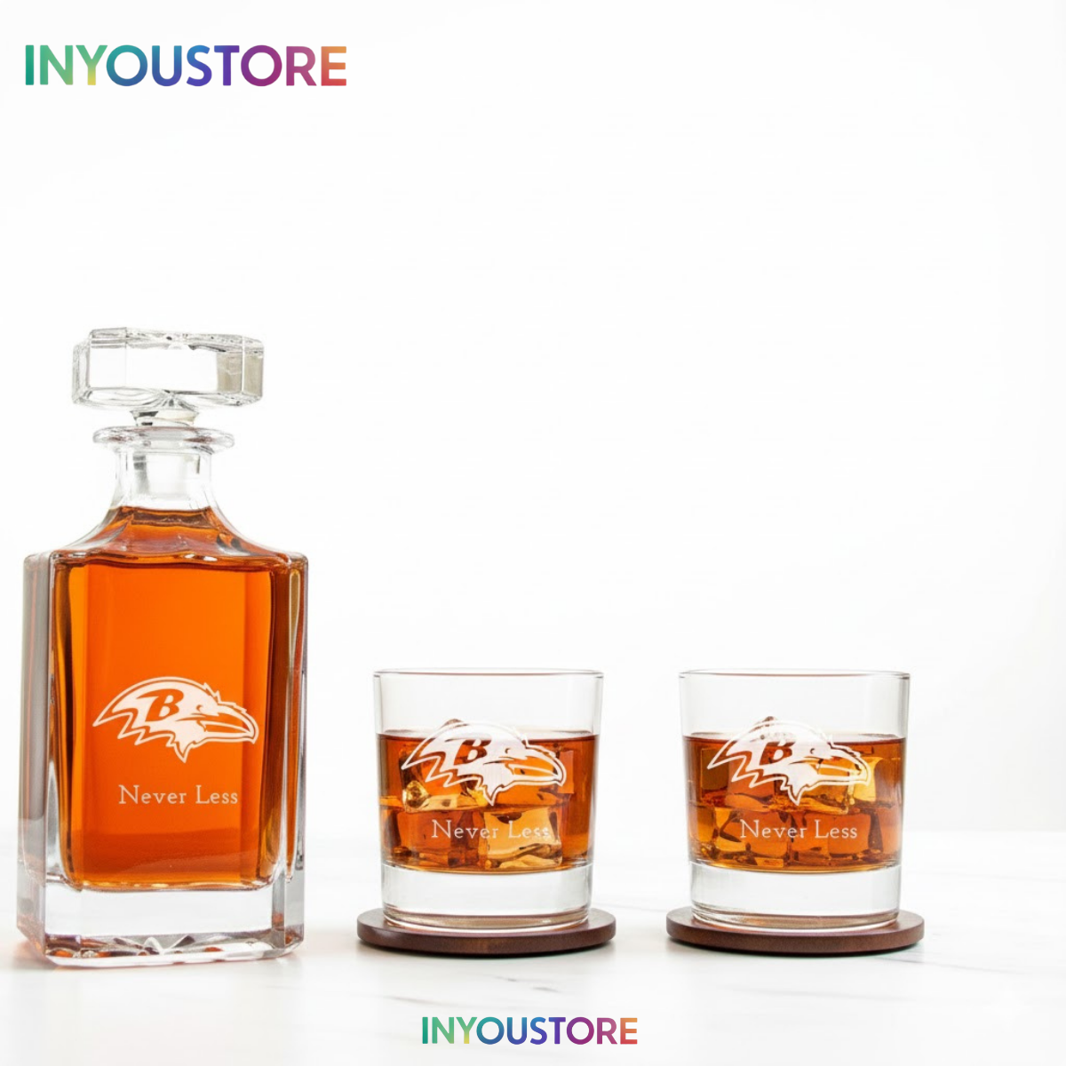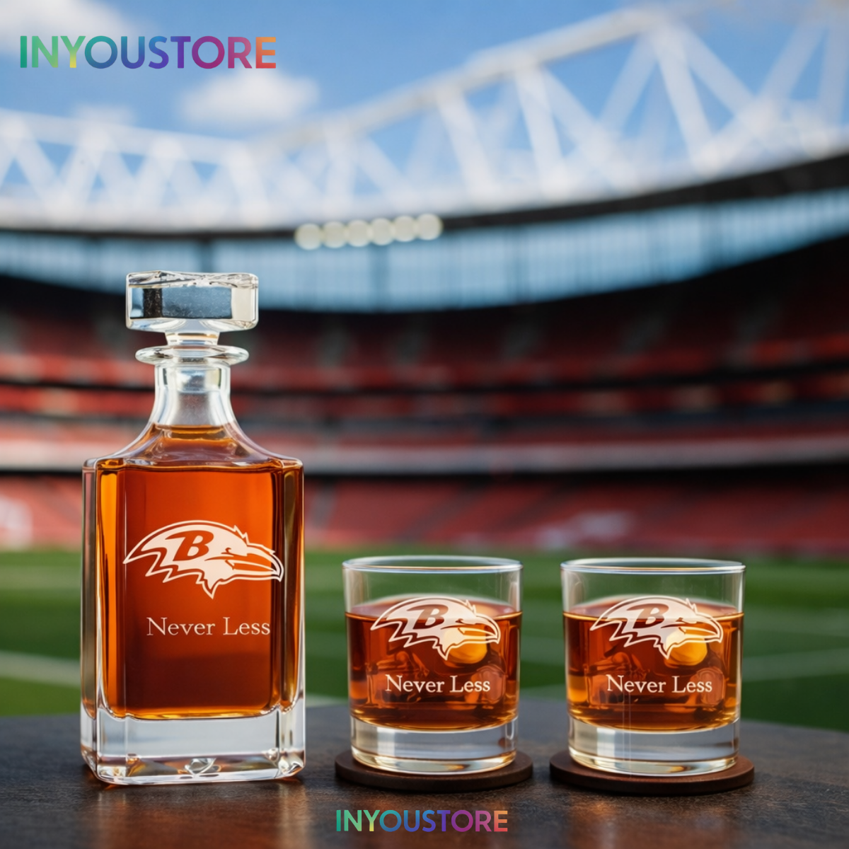 Protect the Bank with this Men’s Baltimore Ravens Custom Engraved Whiskey Decanter Gift Set. Premium glassware featuring laser-etched NFL logos.