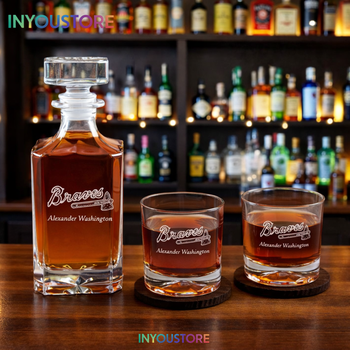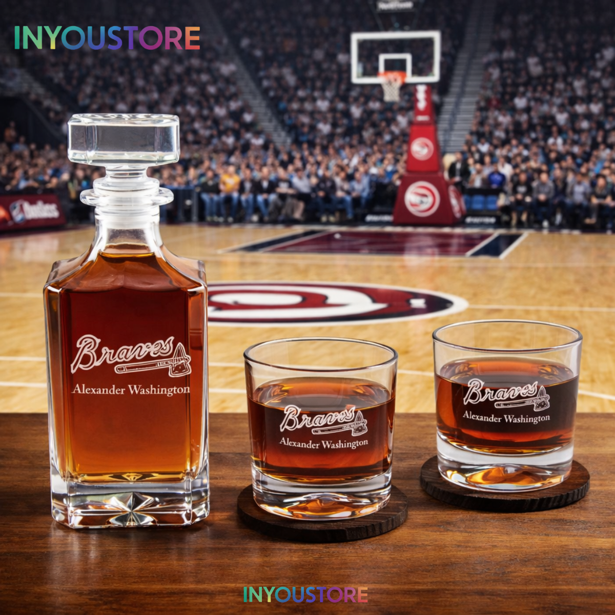 Elevate your bar with this Men’s Braves NBA Custom Engraved Whiskey Decanter Gift Set. Premium glassware for basketball fans.