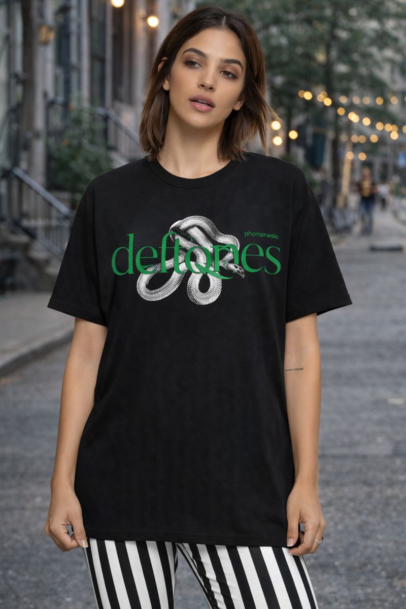 Product Description: Channel the iconic energy of Sacramento’s finest with our Deftones Snake Logo Oversized Shirt. This premium heavyweight tee features a clean, striking green “Deftones” typography entwined with a detailed snake graphic—a nod to the band’s legendary alternative aesthetic. Designed for fans who value a high-end, boxy silhouette with a minimalist twist, this shirt is a versatile piece for any Alt-metal lover’s collection.