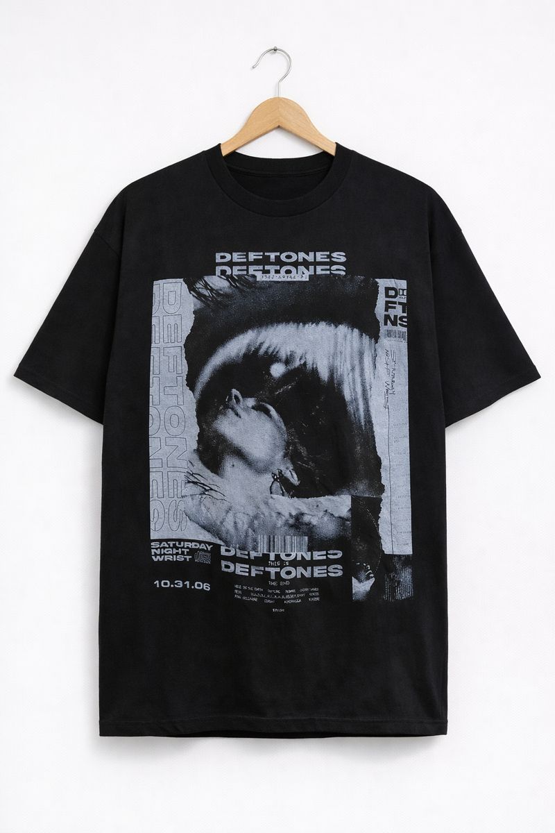 Product Description: Embrace the haunting aesthetic of alternative metal with our Deftones Saturday Night Wrist Oversized Shirt. This premium heavyweight tee features the iconic album-inspired graphic with a modern, gritty streetwear twist. Designed for fans who appreciate the dreamy yet heavy vibe of Chino Moreno’s legendary band, this shirt combines a vintage 90s/00s bootleg look with a contemporary baggy fit.