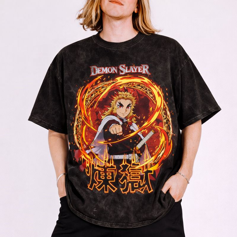 Kyojuro Rengoku Flame Hashira Oversized T-Shirt – Premium Acid Wash Demon Slayer Graphic Heavyweight Tee