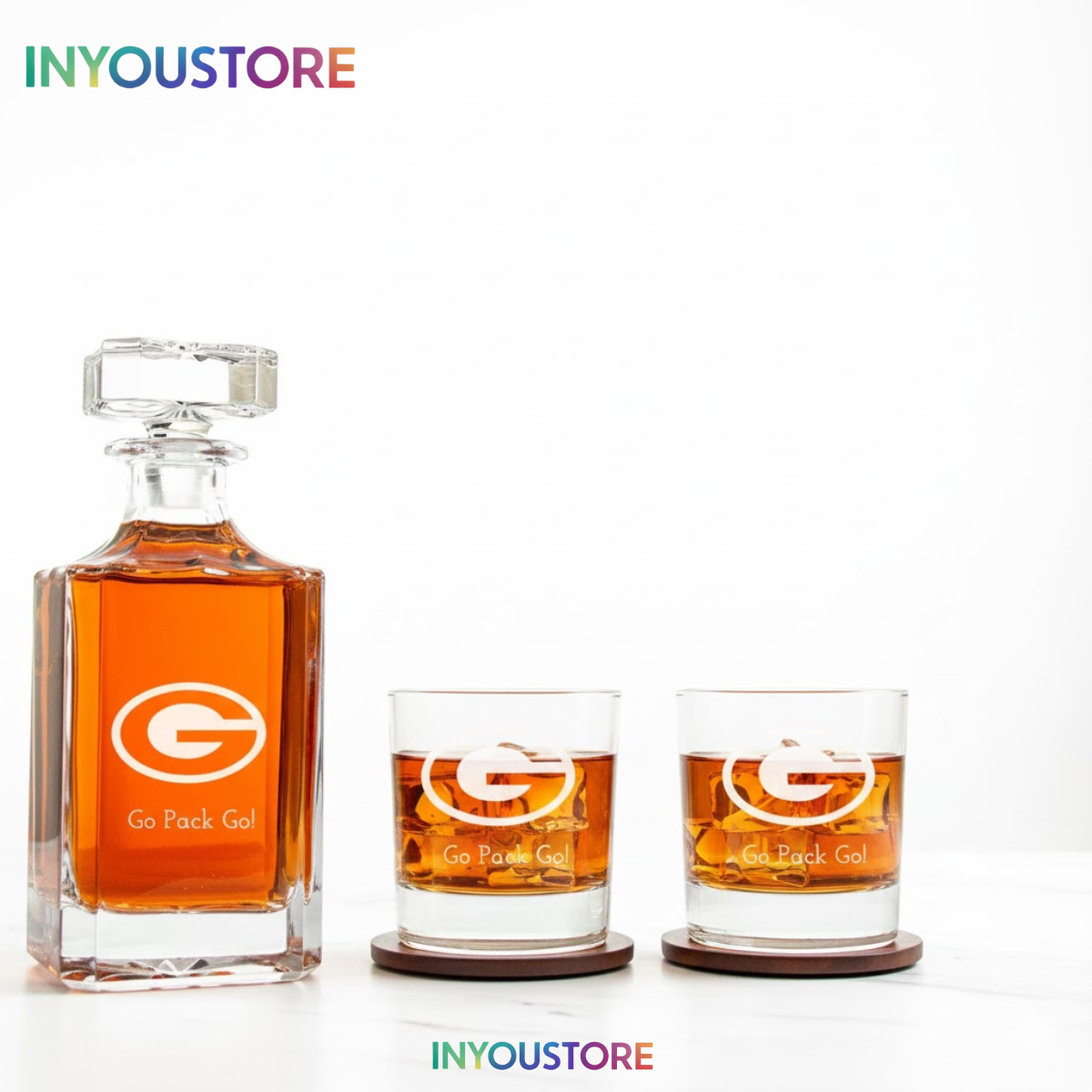 Men’s Green Bay Packers Custom Engraved Whiskey Decanter Set. Premium glassware featuring laser-etched logos.