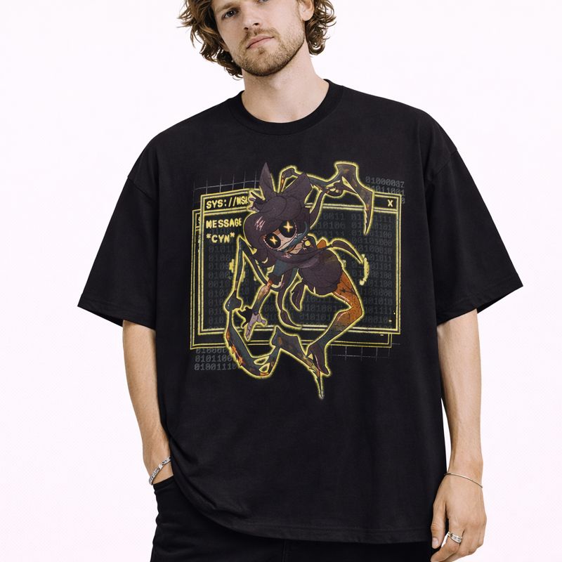 Access the void with our Cyn Murder Drones Oversized T-Shirt. This premium heavyweight tee features a high-definition, neon yellow Absolute Solver interface graphic of the enigmatic Cyn, complete with digital binary code and system message details (“SYS://MSI”). Designed for fans who love the dark, glitchy lore of the series and a modern, boxy streetwear silhouette, this shirt is the ultimate piece for any Glitch Productions enthusiast.