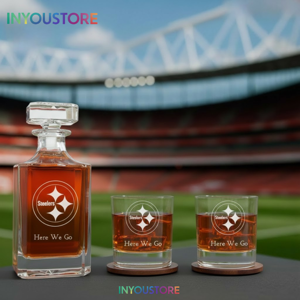 Elevate your home bar with this Men’s Pittsburgh Steelers Custom Engraved Whiskey Decanter Set. Premium glassware featuring laser-etched NFL logos.