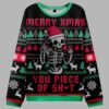 This sweater features a classic “ugly Christmas sweater” design with a very modern, and very adult, twist. The color scheme is a festive mix of black, red, and green. The top and bottom sections are adorned with traditional holiday patterns, including a row of red pine trees and geometric snowflakes. The sleeves also feature a pixelated snowflake pattern. The main event, however, is the central graphic: a hilarious and shocking depiction of a skeleton wearing a Santa hat. Below the graphic, the words “Merry Xmas You Piece Of Shit” are written in a bold, pixelated font.