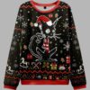 This cozy, crew-neck sweater uses a striking black background, giving it a stylish, gothic look that highlights the festive patterns in red, white, and green. The entire garment is covered in dense, traditional ugly sweater Fair Isle patterns, featuring busy rows of snowflakes, wrapped gifts, gingerbread men, candy canes, rocking horses, and mistletoe—all creating a complex, detailed, and beautifully chaotic border. The central graphic is the masterpiece of festive mischief: a large, stylized black cat is seated, looking both surprised and completely guilty. The cat’s whiskers are long and frenetic, and its eyes are wide with a frantic, slightly unhinged look. It is attempting to look festive by wearing a Santa hat and a red and white striped scarf. The cat is surrounded by the aftermath of its fun—scattered presents, knocked-over rocking horses, and holiday treats. The overall image captures the look of a creature caught mid-rampage, having just destroyed the living room decorations.