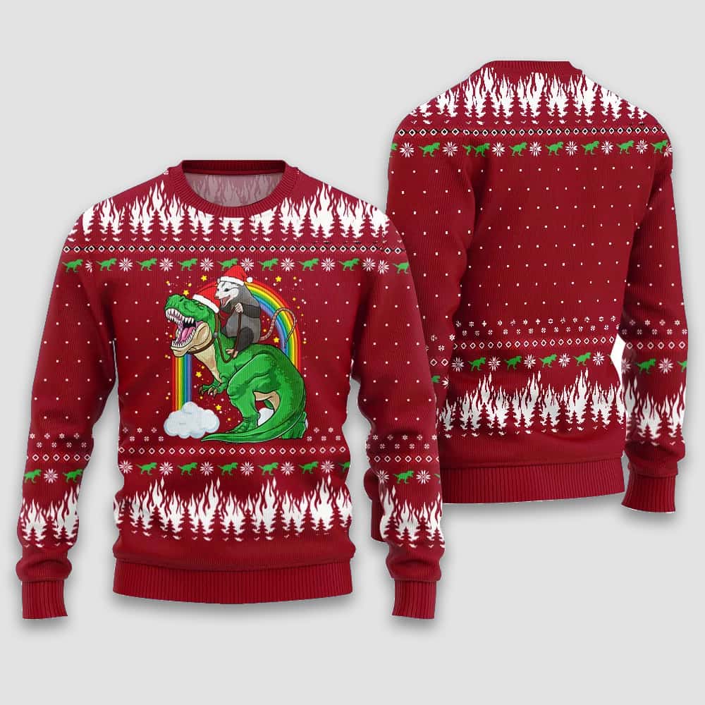 Unleash holiday chaos with the Opossum Riding Dinosaur Ugly Christmas Sweater. A bold fusion of prehistoric rebellion and modern satire, this sweater sparks conversation and laughter. Perfect for those who love quirky fashion with a dash of social commentary.