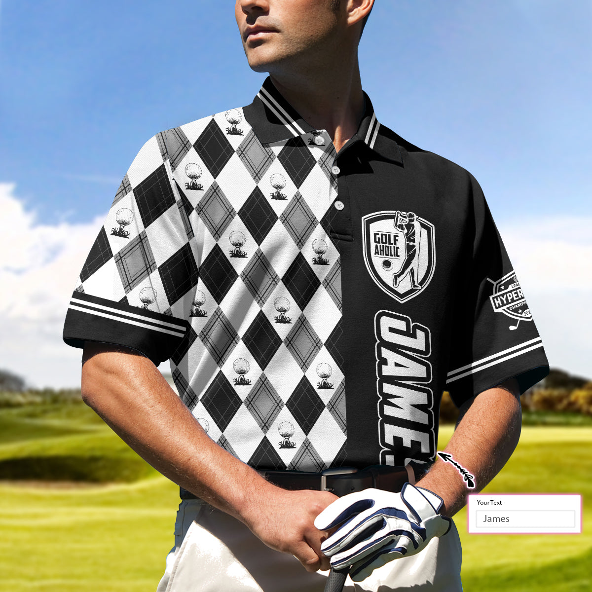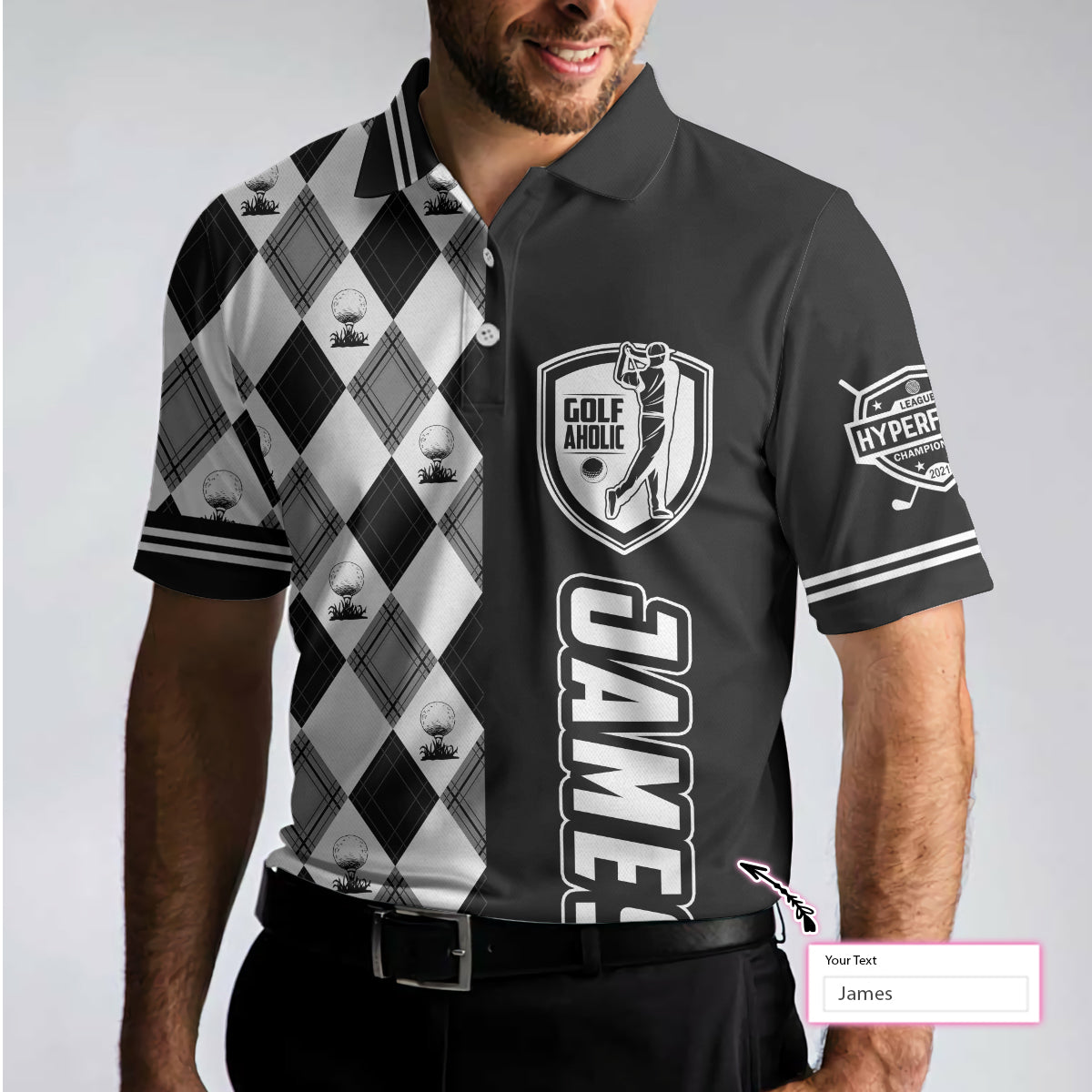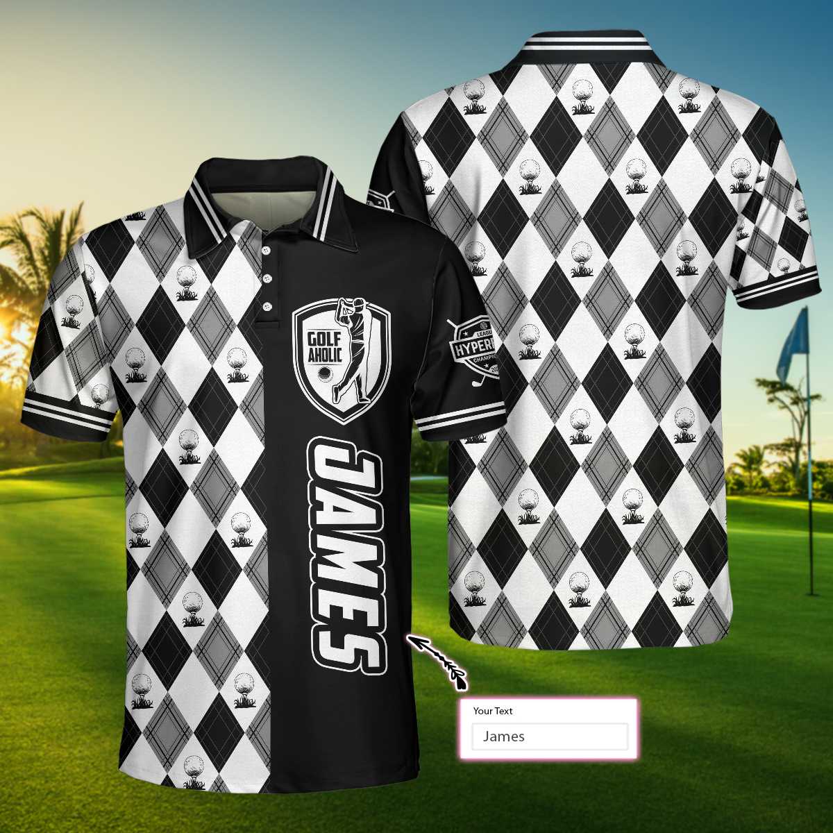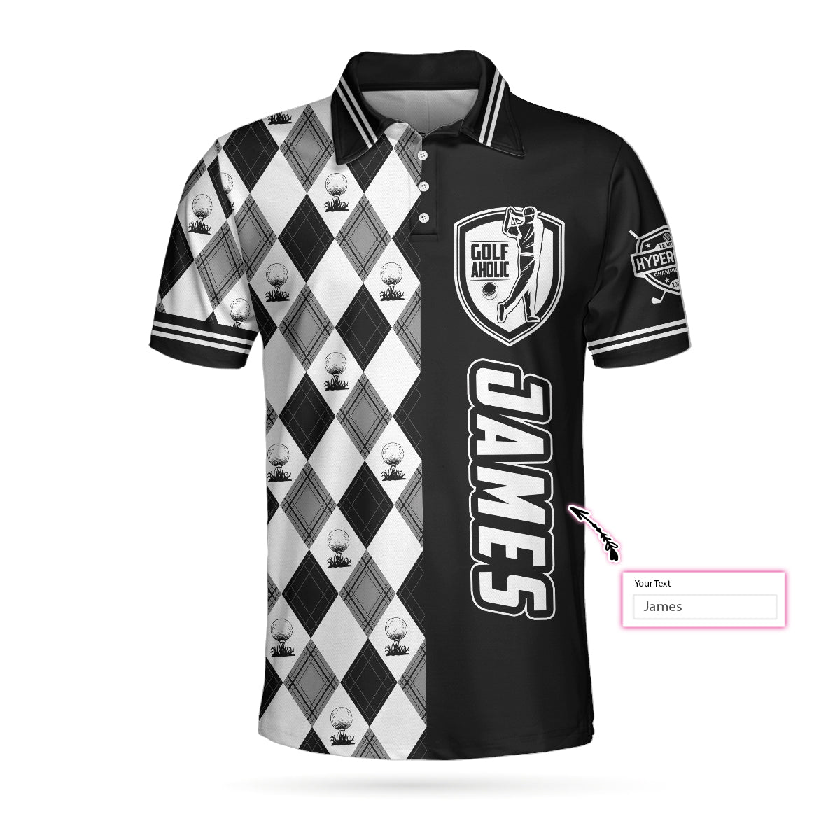 Personalized Golfaholic Custom Polo Shirt, Black And White Argyle Pattern Polo Shirt, Best Golf Shirt For Men