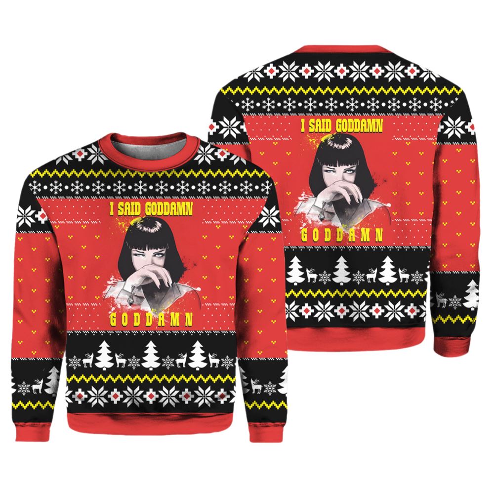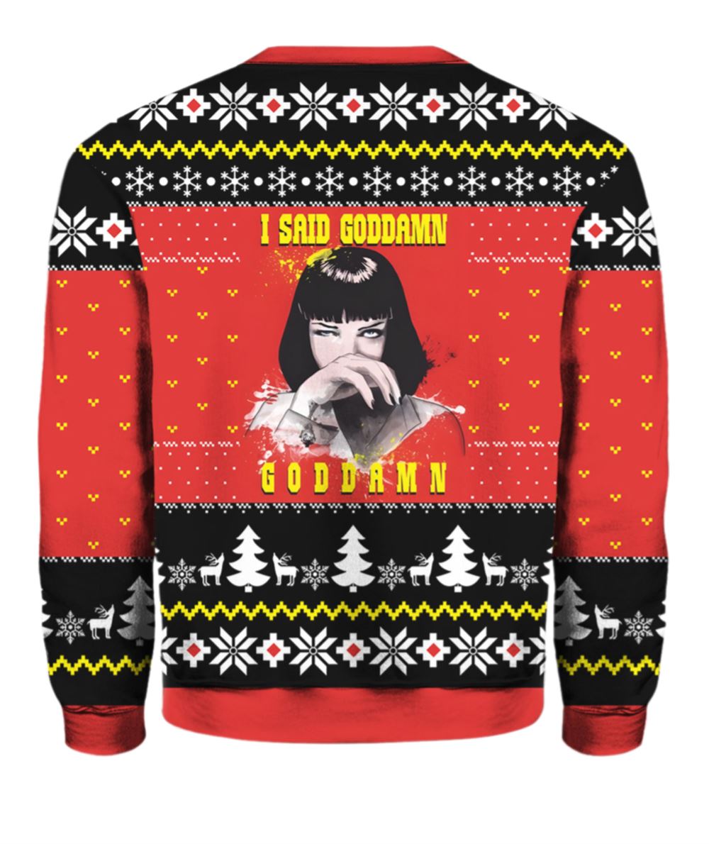 This Christmas, ditch the reindeer and embrace your inner badass with this Pulp Fiction Ugly Christmas Sweater. Featuring Mia Wallace and her iconic “goddamn” quote, this sweater is guaranteed to be a conversation starter at any holiday gathering.