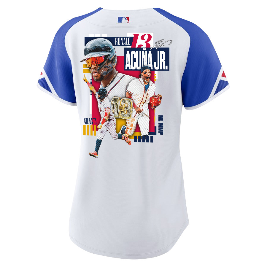 Ronald Acuña Jr. 13 Atlanta Braves Signed MVP 2023 City Connect Player Women Baseball Jersey – White Blue – JS326
