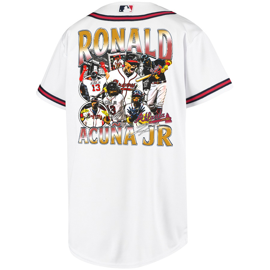 Ronald Acuña Jr. 13 Atlanta Braves Signed Posture 2023 Home Player YOUTH Baseball Jersey – White Red – JS968