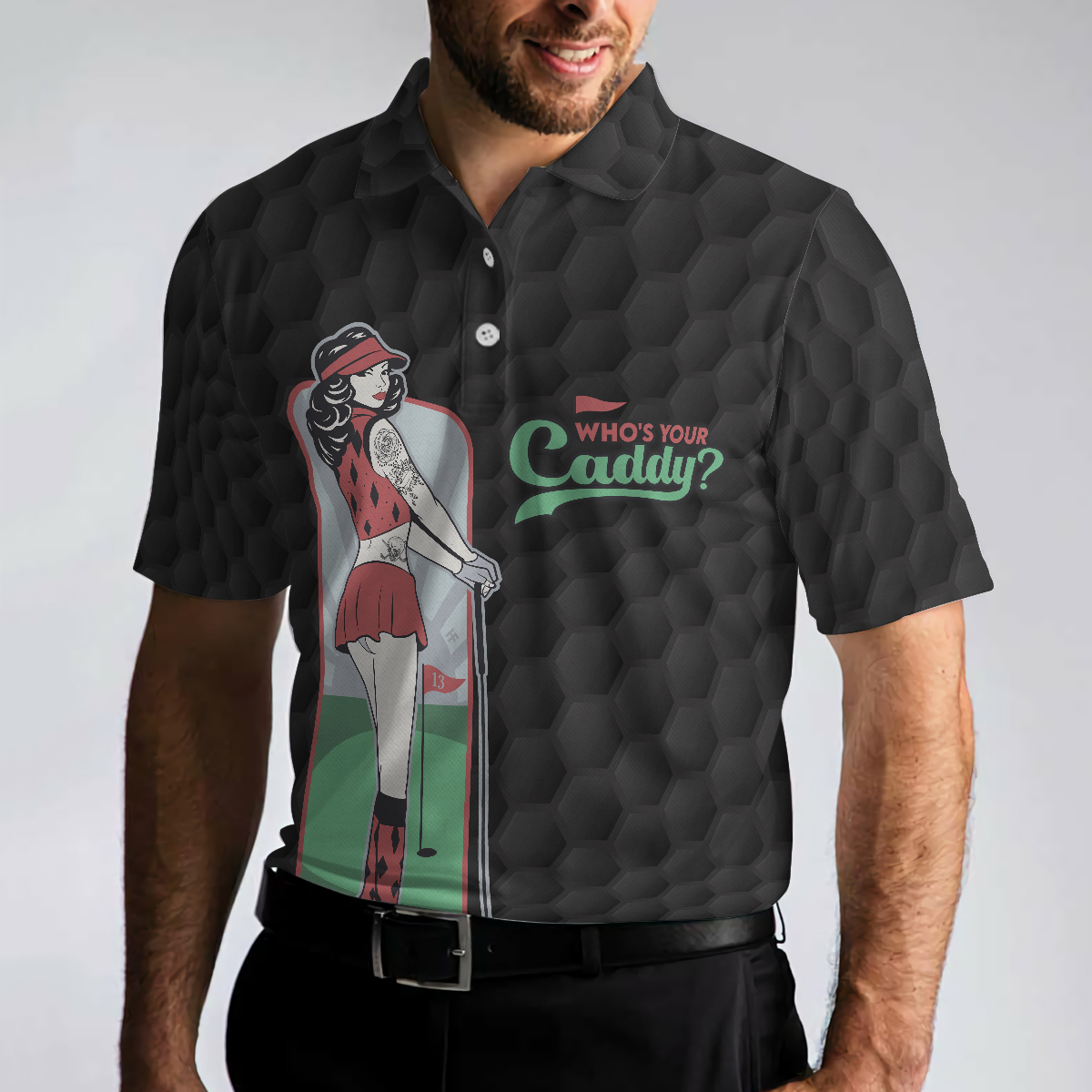 Sarcastic Shirt Who’s Your Caddy Polo Shirt, Black Golf Pattern Polo Shirt, Unique Golf Shirt For Men