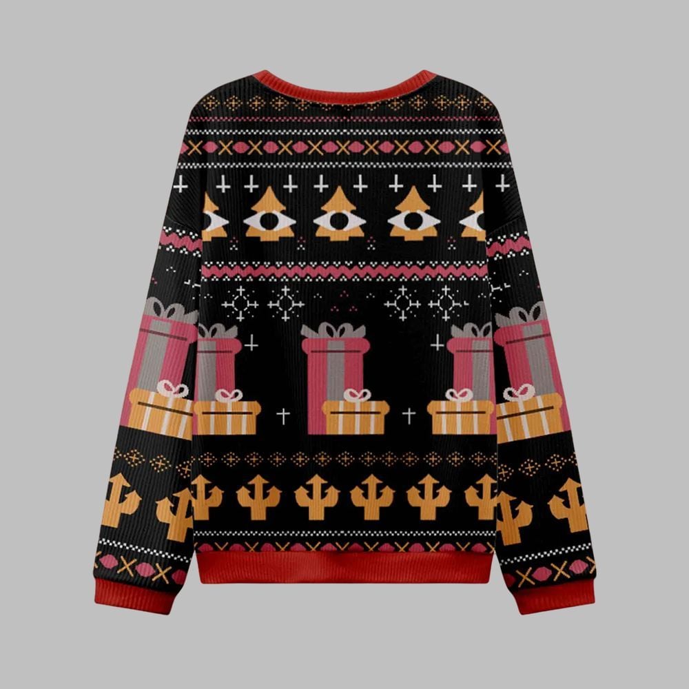 At the heart of the design sits our beloved anti-hero, Satan Claus, a Baphomet-inspired figure rendered in stunning detail. Complete with a cozy Santa hat, majestic horns, and a serene, meditative pose, he offers a peaceful, yet powerful, alternative to the usual jolly old elf. Surrounded by cheekily wrapped gifts, this sweater perfectly captures the spirit of giving, albeit with a deliciously dark twist. The intricate patterns, featuring esoteric symbols, inverted crosses, and even some festive desert cacti, create a rich tapestry of yuletide rebellion.