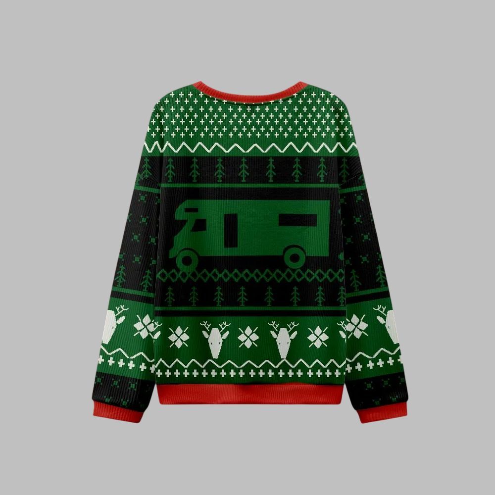 This isn’t just another ugly sweater. It’s a statement piece that pays homage to one of the most quotable holiday films of all time. The design prominently features the silhouette of Eddie’s infamous RV, set against a classic “ugly sweater” pattern of festive green, black, and red. Adorned with pixelated Christmas trees, reindeer, and snowflakes, it strikes the perfect balance between traditional holiday cheer and laugh-out-loud comedy. And, of course, emblazoned across the chest is the immortal phrase, “SHITTER’S FULL,” ensuring you’re the center of attention from the moment you walk through the door.