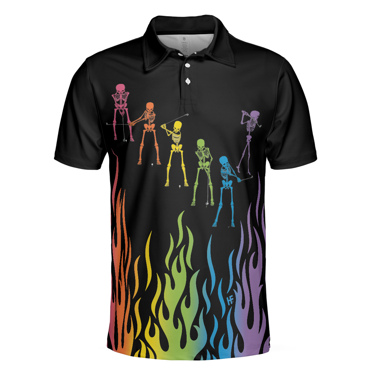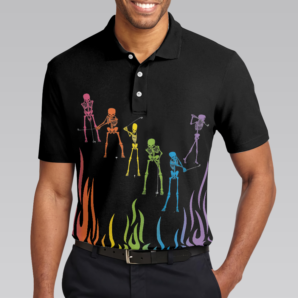 Skeleton Playing Golf Polo Shirt, Rainbow Pallette Fire Golfing Polo Shirt, Cool Golf Shirt For Men