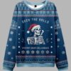 This cozy, crew-neck sweater uses a calming yet festive blue background, perfect for a snowy winter scene, contrasted with red and white accents. The entire garment is covered in dense, traditional ugly sweater Fair Isle patterns, featuring festive icons like snowflakes, stars, holly, and geometric designs, all creating a charmingly busy, winter aesthetic. The central graphic is the core of the joke: a smiling skeleton is prominently featured, wearing a festive Santa hat and a scarf. The skeleton is holding a steaming mug of cocoa or coffee, taking a moment of peace. Above the figure is the first part of the iconic quote: “DECK THE HALLS” and below the skeleton is the punchline: “AND NOT YOUR COLLEAGUES.” The joke is a clever, funny play on words, referencing the common idiom “deck” (to punch/hit) and the stress of dealing with coworkers during end-of-year gatherings. The skeleton’s relaxed pose, despite the dark humor, perfectly embodies the need to remain calm.